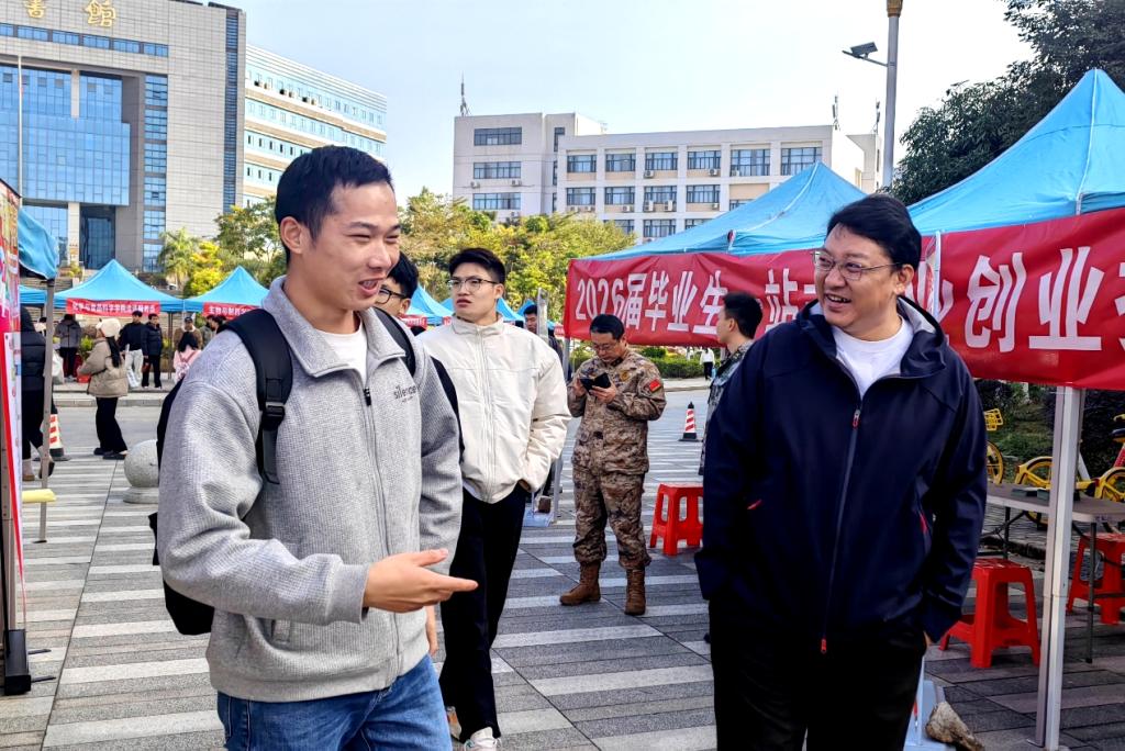 为搭建供需对接桥梁,助力毕业生高质量就业,12月26日,玉林师范学院2026届毕业生冬季校园双选会于我校东校区新民楼景观大道顺利举行。我院党委书记方琨深入招聘会现场指导我院毕业生就业工作。